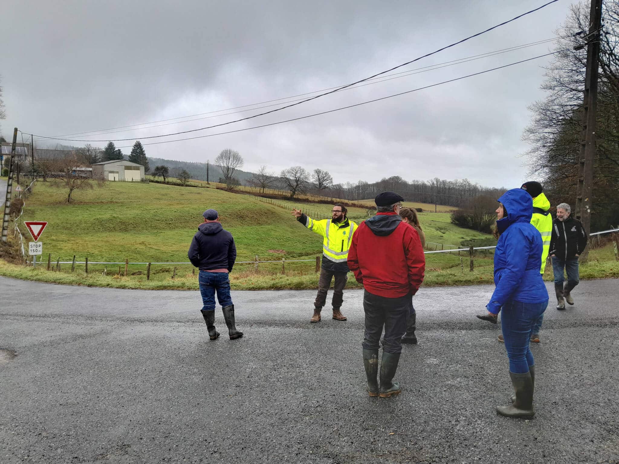 Après un repas partagé, sous forme d’auberge espagnole, les participants ont chaussé leurs bottes et pris de la hauteur. Une lecture de paysage leur a été proposée à Brumas (lieu-dit de Bussière-Galant), afin de repérer les traces laissées par l’eau dans la campagne environnante. Les principaux mots clefs (bassin versant, ruissellement, Dronne…) ont été définis et replacés sur la carte IGN du site. Bravant le vent et la pluie, le groupe est ensuite allé observer une « levade ». Ces petites rigoles, creusées le long des crêtes des champs, permettent à l’eau de ruisseler sur les prés en hiver. Elles faisaient autrefois partie intégrante des pratiques d’irrigation des campagnes limousines.